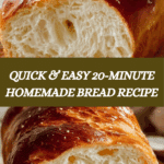 This quick and easy 20-Minute Homemade Bread recipe yields a soft, golden loaf perfect for any meal. Made with simple pantry staples and customizable with herbs, cheese, or garlic, this bread is ideal for when you want fresh bread fast without the hassle of yeast and long rising times.