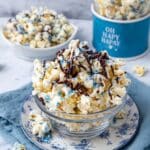 Keywords: Almond Joy Popcorn, popcorn snack, sweet and salty popcorn, chocolate popcorn, holiday snack, party food
