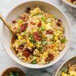 A white bowl filled with fried rice showing a mix of light brown cooked rice, yellow scrambled egg pieces layered unevenly, crispy reddish-brown bacon chunks spread throughout, and scattered with bright yellow corn kernels and fresh green chopped scallions. A golden spoon rests in the bowl, partly deep in the rice. The bowl sits on a white marbled surface with another bowl of fried rice and a wooden bowl of chopped scallions blurred in the background. Photo taken with an iphone --ar 4:5 --v 7