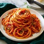 Bucatini all’Amatriciana is a classic Italian pasta dish featuring bucatini noodles tossed in a rich, spicy tomato sauce made with crispy pancetta, onions, garlic, and red pepper flakes. Finished with butter and topped with freshly grated Pecorino cheese and basil, this flavorful recipe is perfect for a comforting and authentic Italian meal.