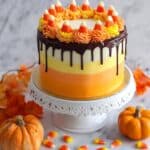 Keywords: Candy Corn Cake, Halloween Cake, Chocolate Cake, Buttercream Frosting, Festive Cake, Fall Dessert