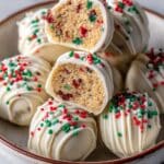 These festive Christmas Tree Cake Truffles transform Little Debbie Christmas Tree Cakes into delightful bite-sized treats coated in creamy white chocolate and decorated with red candy drizzle and green sanding sugar, perfect for holiday celebrations.