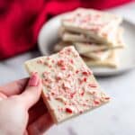 - Add Candy Cane Topping: Immediately sprinkle the crushed candy canes evenly over the white chocolate layer while it is still wet to embed the pieces nicely on top.