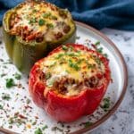 Classic Stuffed Peppers made with tender bell peppers filled with a savory mixture of ground beef, aromatic spices, rice, and melted cheese. This comforting and flavorful baked dish is perfect as a hearty main course and customizable with different proteins or cheeses.