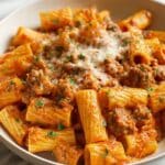 This creamy rigatoni recipe features a rich and flavorful sauce made with ground beef or Italian sausage, garlic and herb Boursin cheese, and classic Italian seasonings. Cooked all in one pot with rigatoni pasta simmered in chicken broth and marinara sauce, it delivers a comforting, cheesy pasta dish perfect for weeknight dinners. Topped with fresh parsley and Parmesan cheese, it’s easy to prepare and deliciously satisfying.