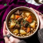- Finish and Serve: Remove and discard the bay leaves and thyme stems. Season the soup with salt and pepper to taste. Serve hot, enjoying the tender beef and hearty grains.