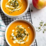 Two white bowls sit on a black grid cooling rack over a white marbled surface, each filled with smooth, bright orange soup. On the soup surface, a swirl of white cream starts at the edges and curls inward, topped with a small pile of green pumpkin seeds and small green herb flakes scattered around. To the right edge of the image, a red and yellow apple adds a touch of color, while on the left side, part of a white cloth with blue grid lines is partially visible. The overall look is fresh and inviting, with clean and simple elements. photo taken with an iphone --ar 4:5 --v 7
