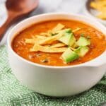 6. Serve with toppings: Ladle the soup into bowls and garnish with tortilla strips, shredded cheese, diced avocado, sour cream, black olives, or green onions as desired.