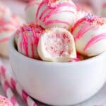 - Color and Drizzle: Melt the remaining 2 ounces of almond bark and stir in 6-8 drops of pink food coloring. Drizzle this pink chocolate over the hardened truffles.