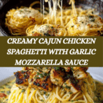 This Easy Creamy Cajun Chicken Spaghetti with Garlic Mozzarella Sauce is a comforting and flavorful one-pan meal that combines tender Cajun-seasoned chicken, perfectly cooked spaghetti, and a rich, creamy garlic cheese sauce. The dish is topped with melted mozzarella and Parmesan, delivering a luscious and satisfying dinner that’s perfect for weeknights or casual gatherings.