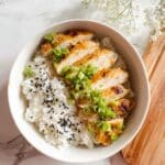 A white bowl holds two main layers: on the left side, there is fluffy white rice topped with scattered black sesame seeds, showing texture in the grains; on the right side, there are five slices of golden-brown cooked chicken laid neatly, each slice with a light char and moist texture, garnished with fresh, bright green chopped scallions spread evenly across the chicken. The bowl is placed on a white marbled surface, with a wooden area visible at the top right corner, and delicate white flowers hanging slightly into the frame above. Photo taken with an iphone --ar 4:5 --v 7
