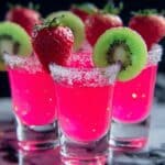 - Garnish the Shots: Add a tiny slice of fresh strawberry or a kiwi slice onto the rim of each shot glass. Optionally, sprinkle mini pink heart sprinkles on top for added decoration.