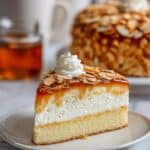 - Final assembly: Using a serrated knife, slice the cooled cake horizontally in half. Spread the custard filling on the bottom layer, leaving a 1/2-inch border around the edges. Place the top layer with the almond topping onto the custard filling and press gently to adhere. Refrigerate the assembled cake for at least 2 hours before serving to let the flavors meld and the custard set.