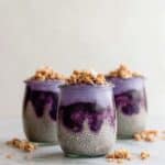 A delicious and nutritious Gluten Free Blackberry Cobbler Chia Pudding featuring a layered chia pudding base, creamy blackberry cashew pudding, and a hint of blackberry preserves and gluten free granola for added texture and sweetness.