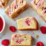 The image shows several pieces of a light golden-brown baked bar with visible red raspberries mixed inside. The bars have a soft, crumbly texture and are topped with thin pink drizzle. The pieces are arranged on a white marbled surface, with a few whole raspberries scattered around. One piece is cut to show two layers inside: the dense crumbly base with embedded raspberries and the pink glaze on the top layer. A white bowl with a red sauce is partly visible on the left side. Photo taken with an iphone --ar 4:5 --v 7