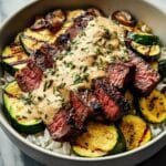 This Grilled Steak Bowl with Sauce & Grilled Zucchini Bliss is a flavorful and satisfying meal perfect for any weeknight or special occasion. Combining tender steak, smoky grilled zucchini, and a creamy herb sauce, it’s easy to prepare and highly customizable to your taste.