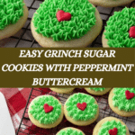 These Grinch Sugar Cookies are festive, buttery, and perfectly soft, featuring a classic vanilla sugar cookie base decorated with a smooth peppermint-flavored buttercream frosting tinted green and topped with adorable heart sprinkles. Ideal for holiday celebrations, these cookies combine straightforward baking techniques with charming presentation.