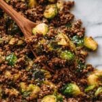 Keywords: ground beef recipe, Brussels sprouts recipe, sweet chili sauce, quick skillet dinner, healthy beef meal