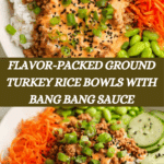 These Ground Turkey Rice Bowls are a flavorful and healthy meal option featuring a savory ground turkey mixture seasoned with garlic, ginger, and soy sauce, topped with a creamy and spicy bang bang sauce. Paired with rice and fresh vegetables, this versatile dish is perfect for quick weeknight dinners or meal prep.