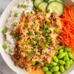 These Ground Turkey Rice Bowls are a flavorful and healthy meal option featuring a savory ground turkey mixture seasoned with garlic, ginger, and soy sauce, topped with a creamy and spicy bang bang sauce. Paired with rice and fresh vegetables, this versatile dish is perfect for quick weeknight dinners or meal prep.