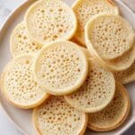 There are nine round flatcakes stacked closely on a white plate, arranged in a circular pattern with some overlapping each other. Each flatcake has a light golden color and is covered with many small holes all over its surface, showing a soft and spongy texture. The edges of the flatcakes are smooth and slightly darker. The plate sits on a white marbled surface with a subtle pattern. photo taken with an iphone --ar 4:5 --v 7