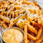 Store leftover fries and cheese sauce separately in airtight containers in the refrigerator for up to 2 days. Reheat fries in a hot oven or air fryer to restore crispiness, and warm the cheese sauce gently on the stove or in the microwave before serving.