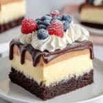 The dessert is a square piece of cake with three clear layers: a thick, dark brown chocolate base at the bottom, a large middle layer of creamy light yellow custard, and a smooth dark chocolate glaze covering the top, slightly dripping down the sides. On top of the glaze, there are three swirls of white whipped cream, each decorated with fresh blueberries and raspberries, and a light dusting of powdered sugar. The cake sits on a plain white plate, placed on a white marbled surface with another similar cake blurred in the background. Photo taken with an iphone --ar 4:5 --v 7