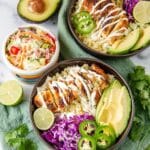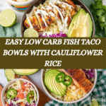 These Low Carb Fish Taco Bowls are a delicious and healthy twist on traditional tacos, featuring baked cod fillets seasoned with taco spices, served over pineapple lime cauliflower rice and sweet and spicy coleslaw, topped with creamy honey lime crema and fresh avocado slices. Perfect for a light and flavorful meal that’s low in carbohydrates.