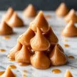 A close-up view of a small pile of glossy, caramel-colored dollops arranged in a pyramid shape on a white marbled surface. Each dollop has a smooth, shiny texture and a pointed peak at the top, with a slight drip of caramel sauce scattered around them on the surface. In the blurred background, more dollops can be seen spread out, softly out of focus against a dark backdrop. Photo taken with an iphone --ar 4:5 --v 7