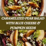 This pear salad combines sweet, tangy, and savory flavors with a satisfying crunch. Caramelized pears, toasted pumpkin seeds, and creamy blue cheese come together over fresh greens for a refreshing and elegant dish perfect for any season.