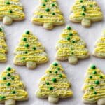 - Decorate Cookies: Use a fork to drizzle the melted candy melts over the cooled cookies. Immediately sprinkle white nonpareils over the drizzle before the candy sets. Place green ball sprinkles using tweezers for precise decoration.