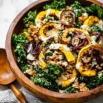 Keywords: Roasted squash salad, delicata squash recipe, winter squash salad, kale salad, Parmesan dressing, holiday side dish