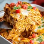 Keywords: shredded chicken, enchilada casserole, baked enchiladas, Mexican casserole, chicken enchiladas, easy dinner, comfort food