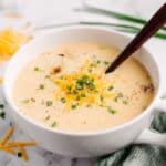 5. Serve and Garnish: Ladle the soup into bowls and top with chopped chives, crumbled bacon, and additional cheddar cheese as desired. These toppings add texture, flavor, and a lovely finishing touch to the soup.