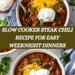 This Slow Cooker Steak Chili is a hearty, comforting dish featuring tender beef chuck roast simmered with kidney beans, tomatoes, and classic chili spices. Slow cooking melds the flavors beautifully, resulting in a rich and flavorful chili perfect for cozy meals.