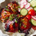 Keywords: sticky chicken thighs, sweet chili chicken, air fryer chicken, caramelized chicken, easy chicken recipe, Asian chicken glaze