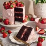 A luscious Strawberry Chocolate Cake featuring a moist cocoa-infused chocolate cake base layered with homemade strawberry jam and fresh diced strawberries, all enveloped in a smooth and creamy strawberry cream cheese frosting. This cake combines rich chocolate flavors with fresh strawberry sweetness, perfect for celebrations or indulgent dessert moments.