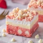 - Serve or Chill: Cut into squares and serve immediately or refrigerate until ready to serve. Optionally garnish with fresh strawberries for added freshness.