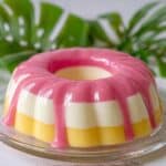 A round layered gelatin dessert in a clear glass ring-shaped dish sits on a white marbled surface. The dessert has three visible layers: the bottom layer is yellow and smooth, the middle layer is a thin bright pink band, and the top layer is thick and creamy white. A shiny pink sauce drips slowly over the sides from the top, creating an even, smooth glaze that follows the curved ridges of the mold. Green leaves are arranged in the background, adding a fresh touch to the scene. photo taken with an iphone --ar 4:5 --v 7