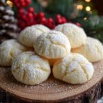 Seven round, pale yellow cookies with a soft, cracked surface are sprinkled with a white powdery sugar on top. They are arranged closely on a rustic wooden slab with visible tree rings and bark edges. The background includes blurred holiday decorations with a red berry cluster, green pine sprigs, and a pine cone, all set on a white marbled texture. The lighting is warm and soft, creating a cozy feel. photo taken with an iphone --ar 4:5 --v 7