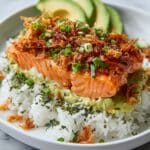 This Teriyaki Salmon Sushi Bake is a comforting and flavorful twist on traditional sushi, featuring tender Coho salmon marinated in teriyaki sauce and broiled over a bed of sticky sushi rice. Topped with creamy avocado, spicy mayo, furikake seasoning, crispy fried onions, and fresh scallions, this dish offers a perfect balance of savory, sweet, and spicy flavors in an easy-to-make casserole format perfect for sharing.