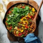 A vibrant and flavorful Vegetable Paella featuring zucchini, mushrooms, peas, piquillo peppers, and spinach cooked in a rich tomato and saffron-infused broth. This classic Spanish dish is prepared in an ovenproof skillet, resulting in tender rice with a crisp bottom layer, perfect for a hearty vegetarian meal.
